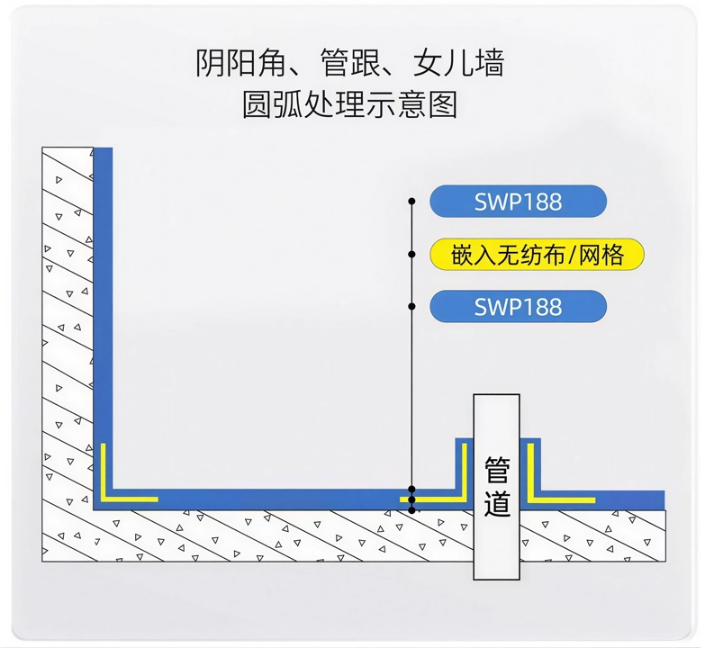 2-3. Waterproof Coating Construction:Node Treatment1.After cleaning the internal corner, brush the first coat of waterproof coating on internal corners/pipe roots; embed pre-cut non-woven fabric/fiberglass mesh cloth (appropriate weight) into the coating, press firmly with a trowel/brush, then apply the second coat on the cloth.